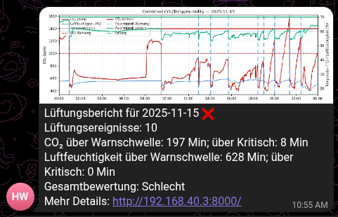 Das aktive Anschauen der Statistiken auf dem Dashboard ist eine bewusste Entscheidung, die man im Alltag leicht vergisst. Darum habe ich einen Telegram‑Bot erstellt, der jeden Morgen um 7 Uhr einen Bericht über den letzten Tag in unseren WG‑Chat schickt. Das soll zusätzlich helfen, das Bewusstsein zu stärken und die Luftqualität im Alltag zu verbessern.